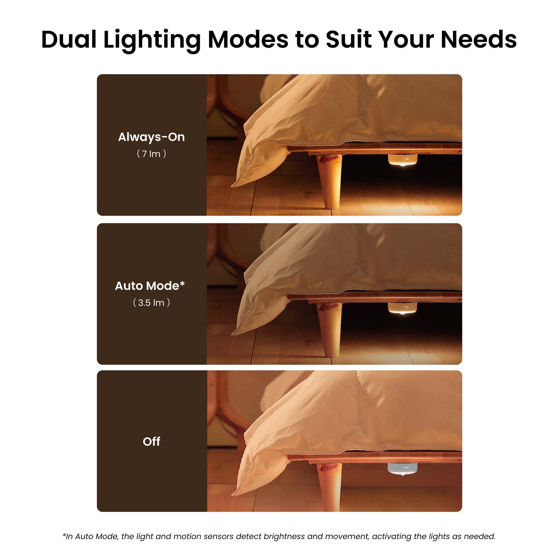 - Dual lighting modes: Auto Mode: Automatically activates the light at 3.5lm when motion is detected