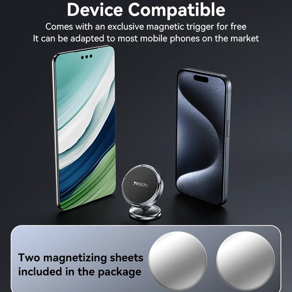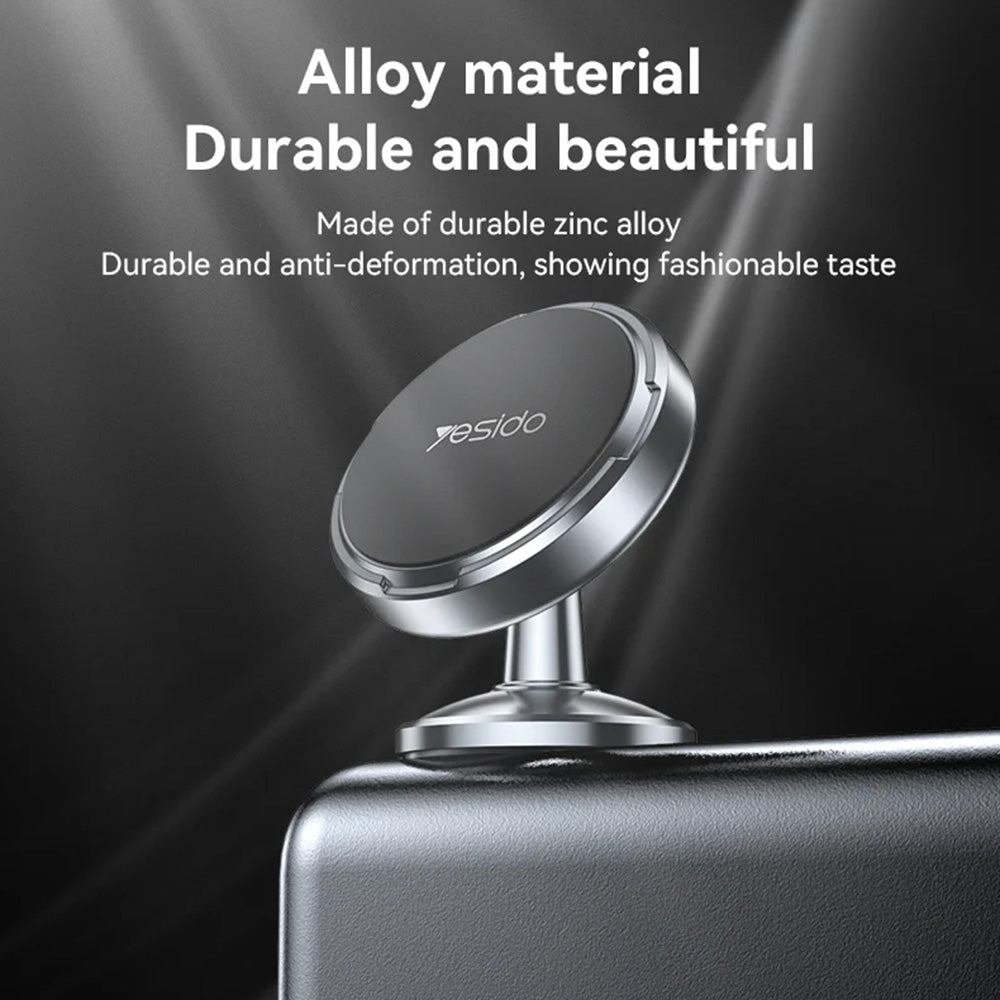 Looking for a magnetic car holder that mounts on the dashboard? Buy the Yesido car holder now and enjoy every trip! 360 rotation and easy adjustment You can adjust the viewing angle with just one hand, so you can enjoy precise phone positioning at any time. Precise magnetic attachment Equipped with strong N50 magnets, the phone remains stable on the holder even during sudden stops or on uneven roads. Specifications: Materials: zinc alloy, silicone; Mounting type: dashboard; Magnet type: N50; Dimensions: 3cm x 2.5cm; Weight: 76g.