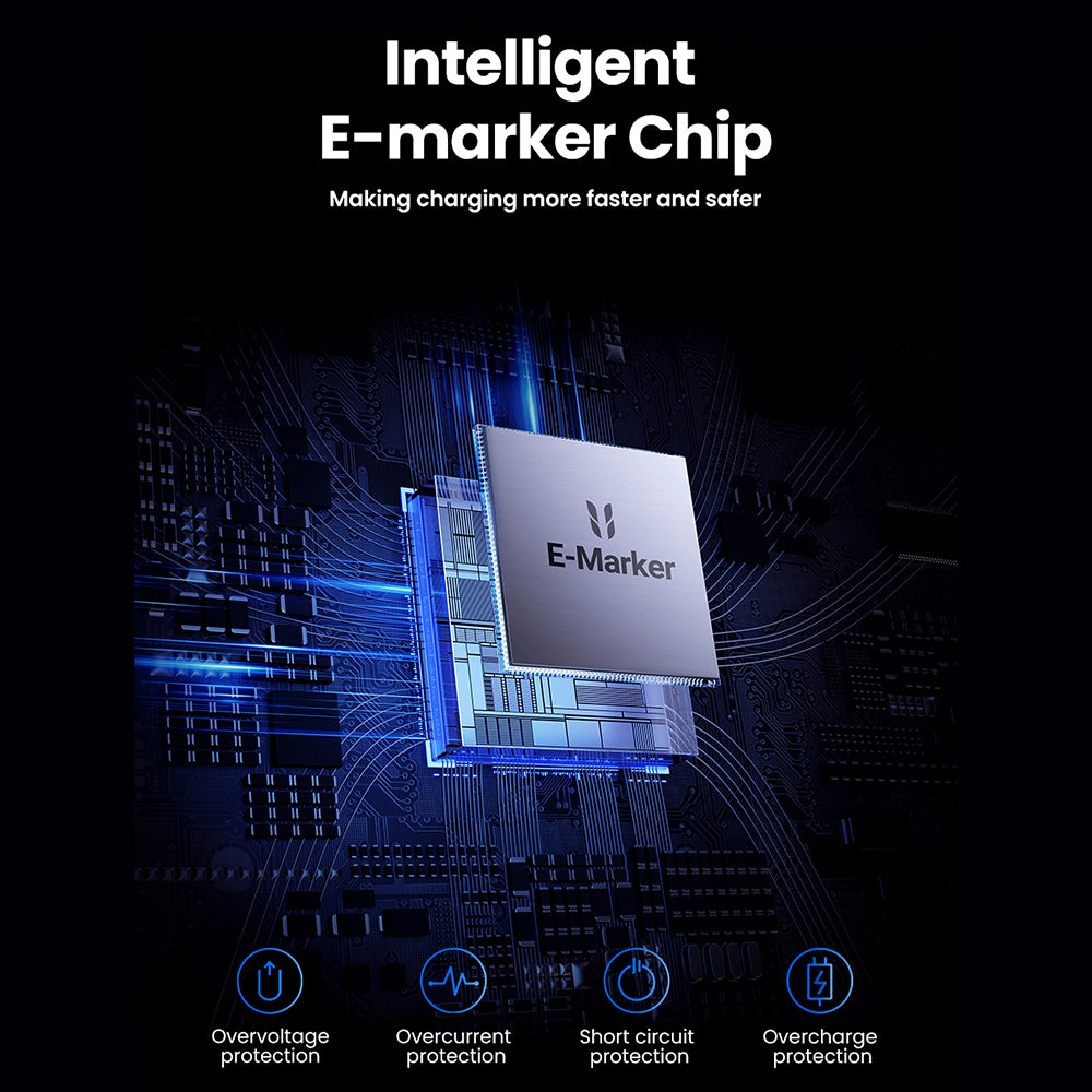 60 minutos - 2.5 vezes mais rápido do que os cabos comuns. O chip inteligente E-marker regula automaticamente a tensão e a corrente para a segurança dos dispositivos, prevenindo