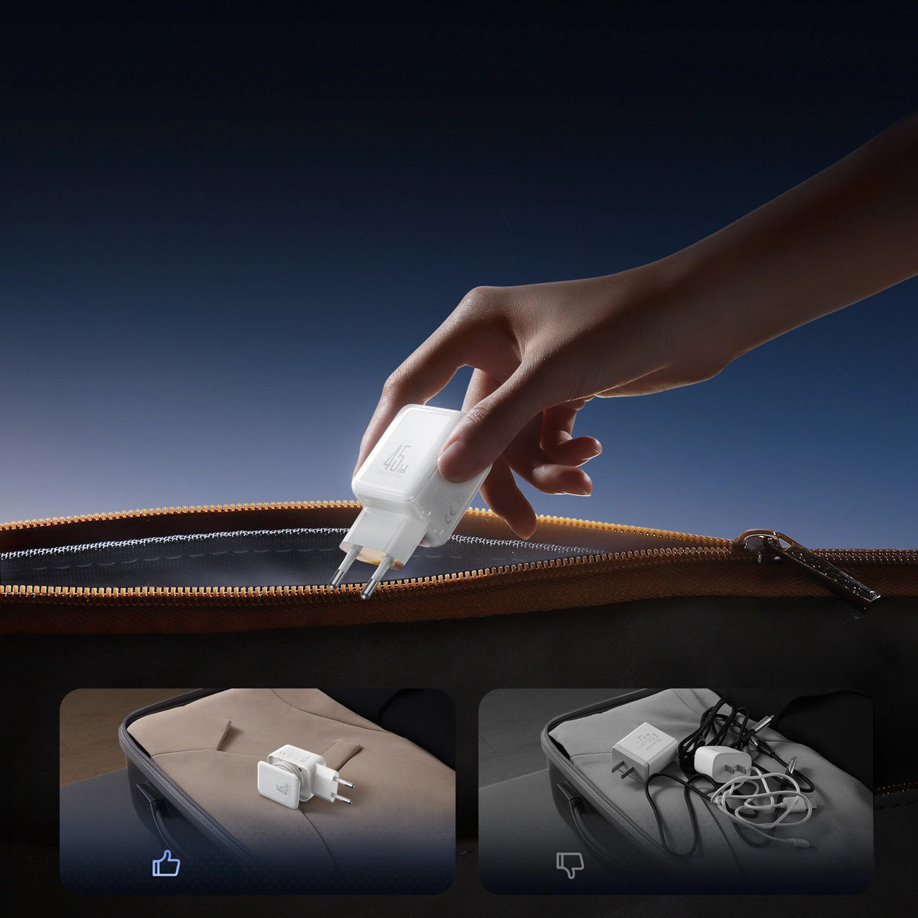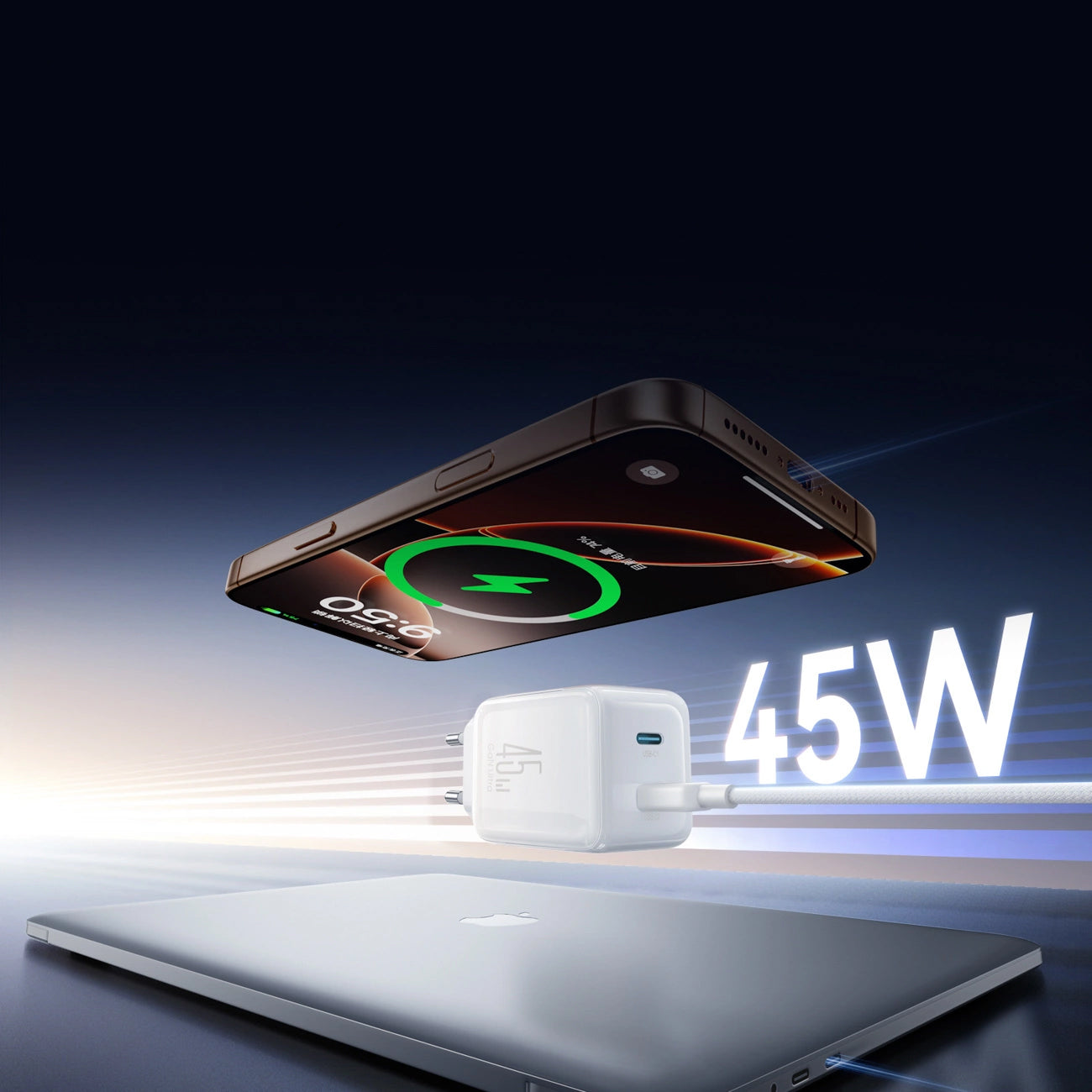 O carregador de rede Joyroom JR-TCL05 é um adaptador compacto GaN de 45W com duas portas USB-C e organizador integrado para cabo.