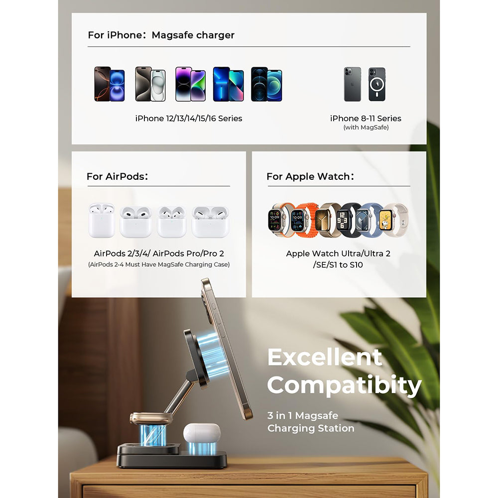 Ideal para iPhone, Apple Watch e AirPods, a estação oferece uma solução unificada de carregamento MagSafe, de modo que cada dispositivo se posicione de forma intuitiva e estável no módulo dedicado.