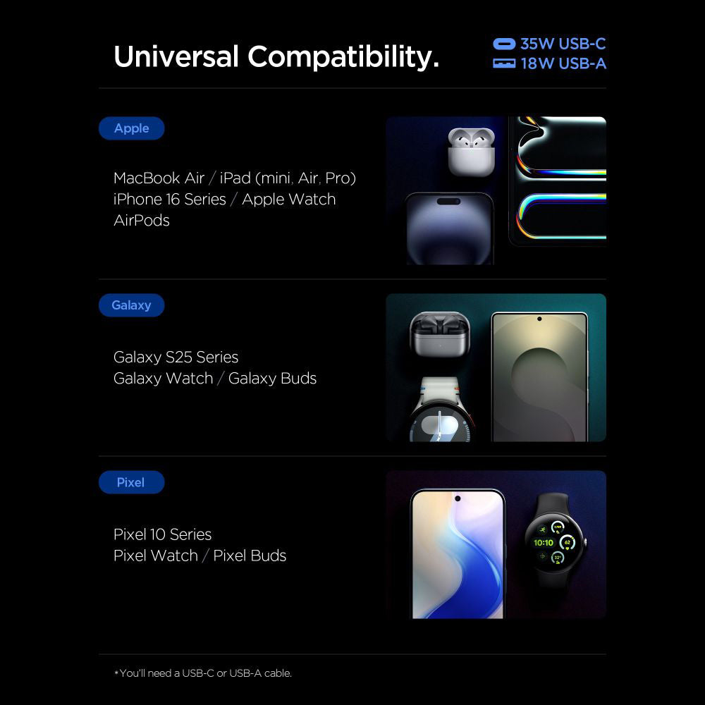 • Spigen integra 2 portas distintas para que possas alimentar simultaneamente um dispositivo moderno Type-C e um acessório compatível USB.