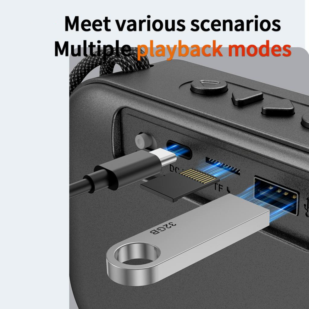 Além da reprodução sem fios, podes ouvir música diretamente de um cartão TF (microSD) ou pen USB, para maior flexibilidade.