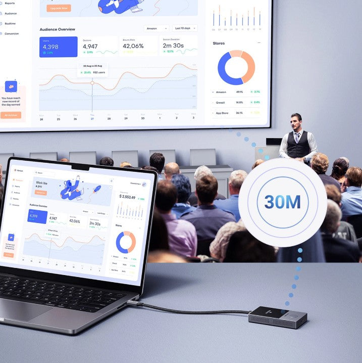 e o receptor conecta-se simplesmente através de HDMI e USB-A ao teu ecrã. Quer queiras projetar um filme na TV, fazer apresentações profissionais