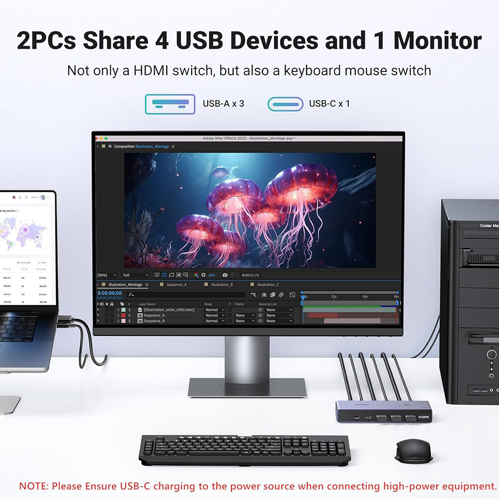 UGREEN CM692 é um switch que permite controlar dois computadores usando um único monitor e quatro dispositivos USB 3.0, como teclado,